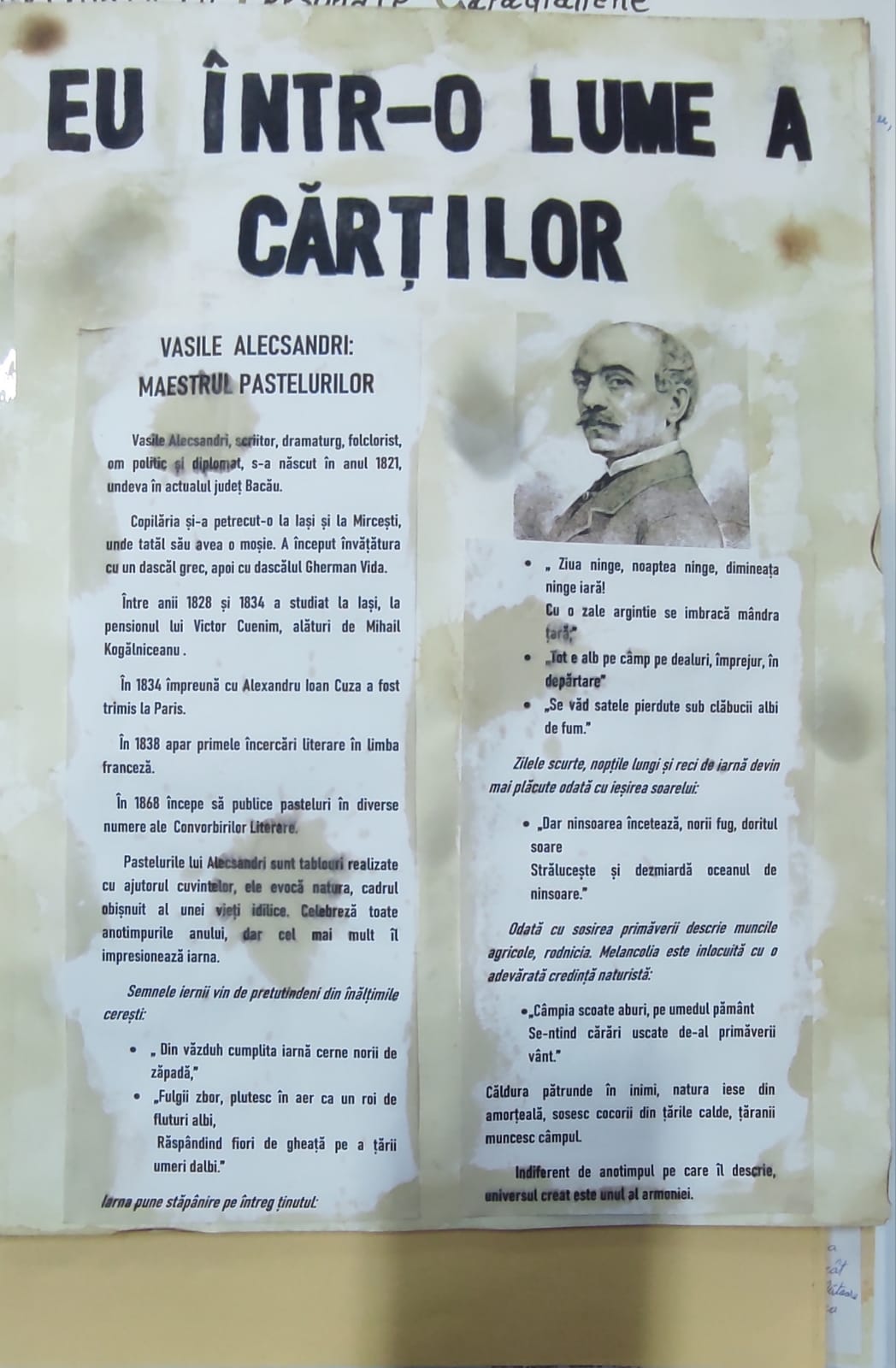 Elevii au readus pastelurile lui Alecsandri la viață, alegând expresii care definesc fiecare pastel și creând compuneri imaginative ce redau aceste tablouri sub forma cuvintelor. Fiecare poezie devine astfel o călătorie poetică în lumea naturală, îmbogățită de imaginație.