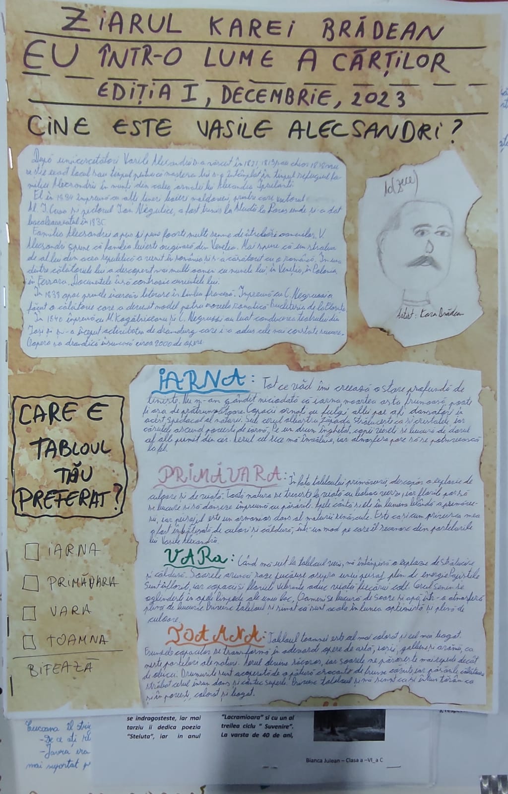Prin acest ziar captivant, elevii din clasa a VI-a C de la școala noastră și-au demonstrat nu doar priceperea lor literară, ci și creativitatea și pasiunea pentru cuvinte, aducându-le într-un mod inedit în fața comunității școlare.